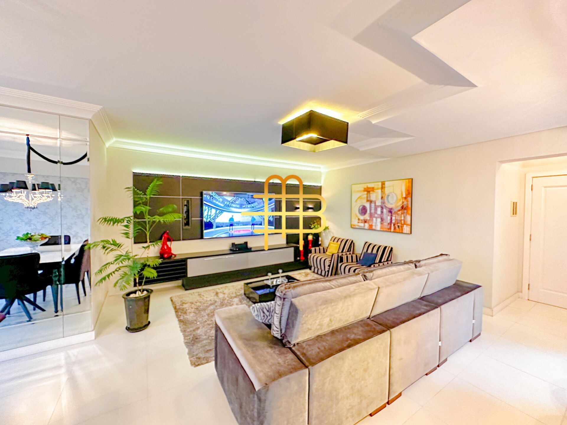 TV de 75'' na sala, TV de 55'' e outra de 40'' incluidas, geladeira Side by Side, coifa digital, máquina lava e seca, mesa pra 6 lugares com poltronas, lustre, sistema de som embutido no painel da TV, camas e etc...