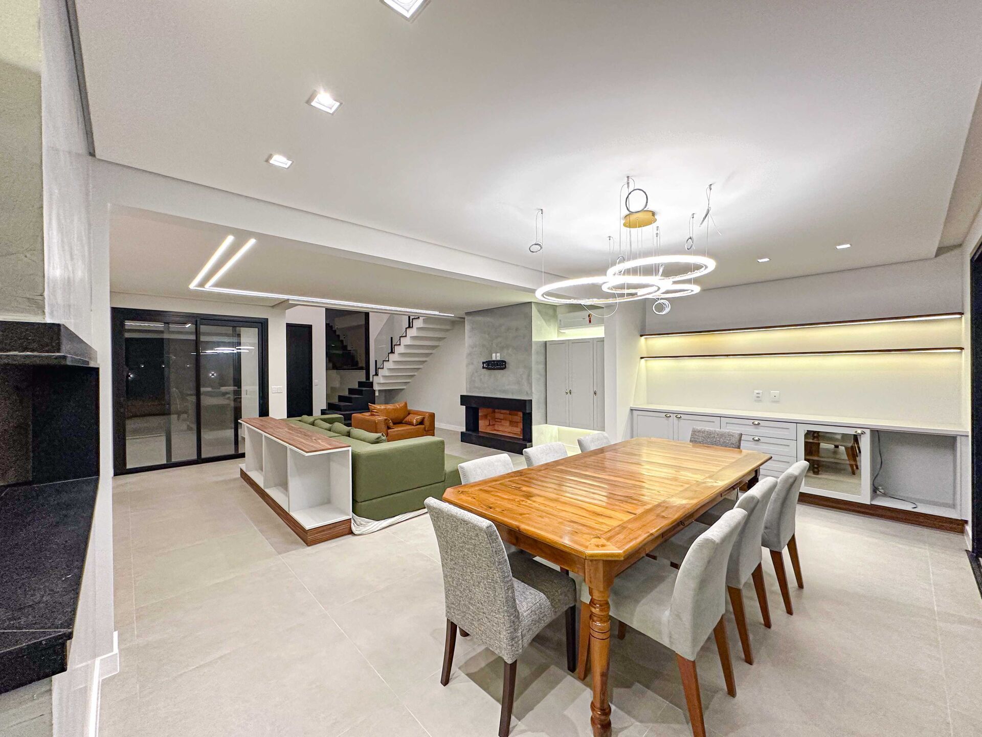 Conta com 3 suítes, sendo uma Master com closet; amplo living integrado com a cozinha, lareira e churrasqueira; lavanderia; pé direito nas escadaria, pra dar a sensação de amplitude; corredores laterais e vaga para 4 carros.