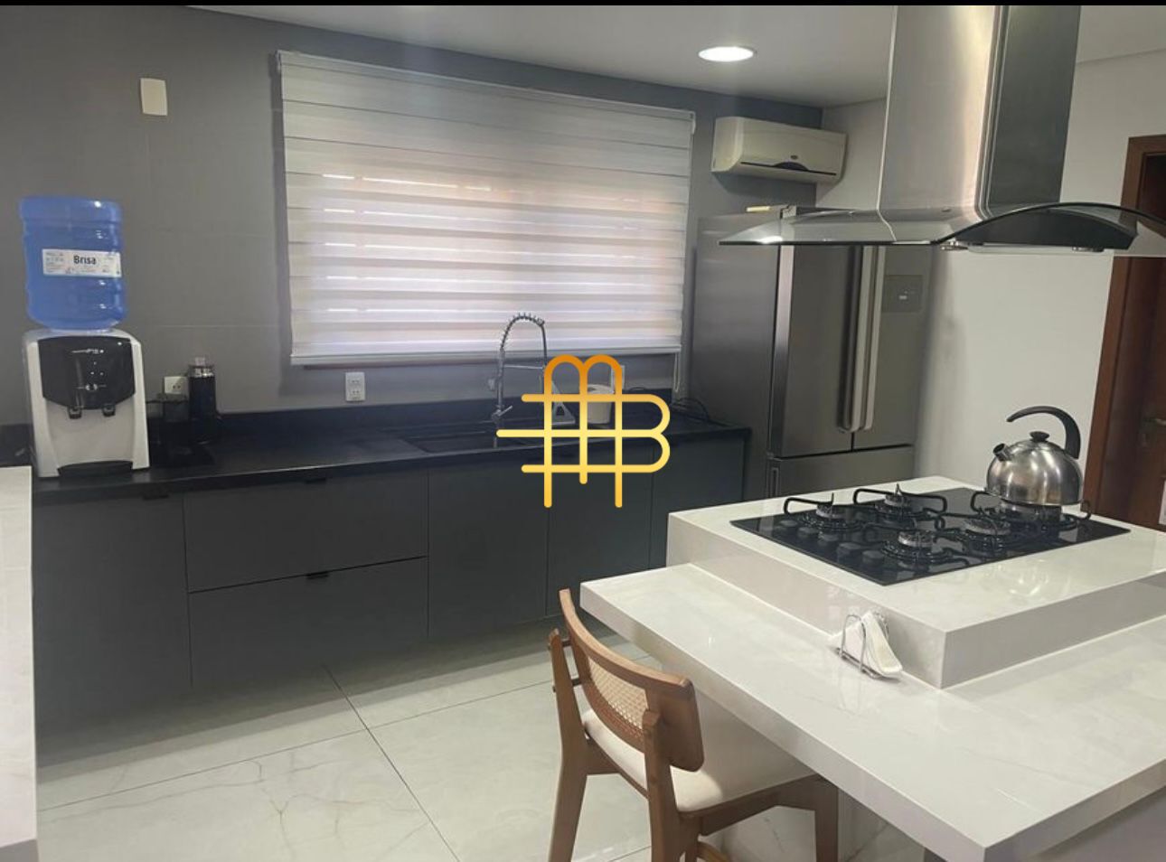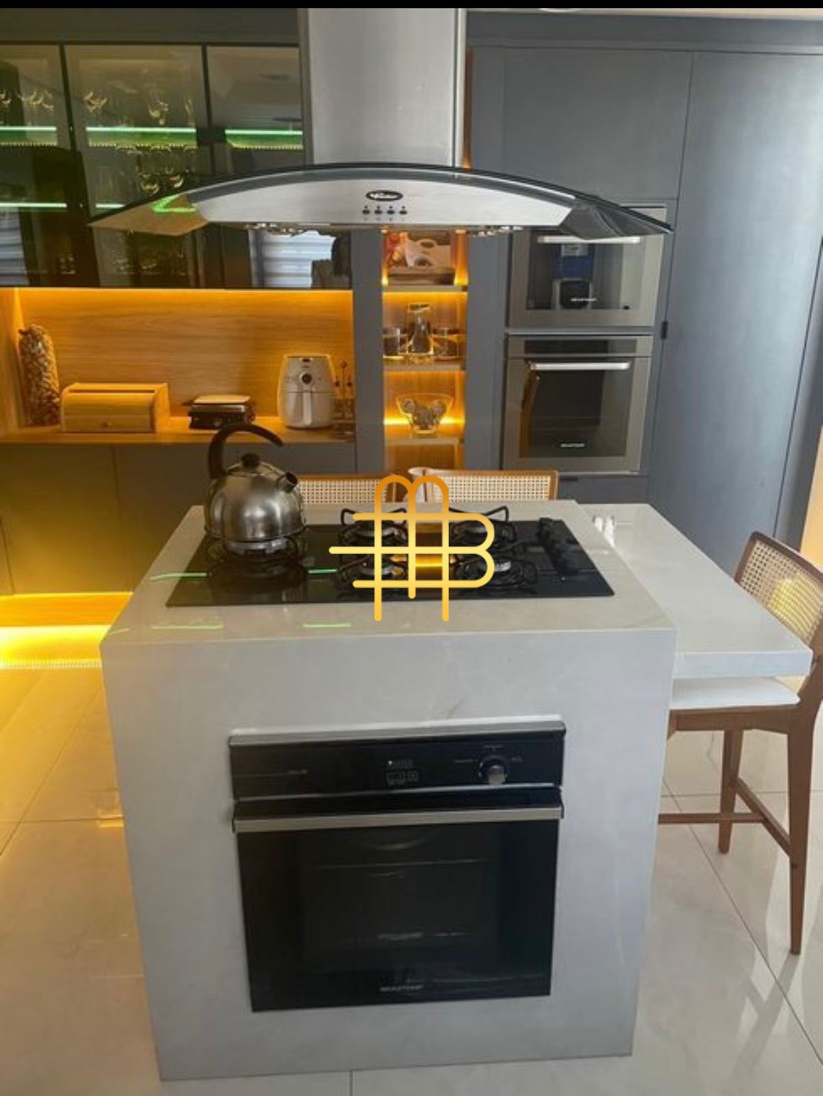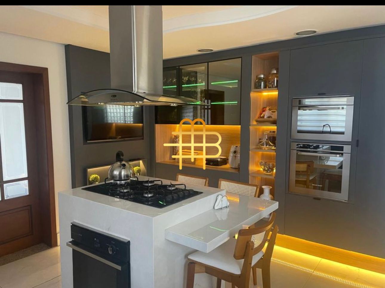 Cozinha ampla e toda mobiliada com 3 fornos embutidos, ilha, cooktop, exaustor, TV, ar condicionado. Área de serviço gigante, com muitos armários do chão ao teto. Garagem comporta 3 carros, possui banheiro completo e bancada para churrasco com armários sob medida.